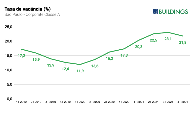 Outro índice que merece destaque no mercado de escritórios de alto padrão diz respeito à taxa de vacância, que neste 4T/2021 também sofreu redução: de 23,05% (3T/2021) para 21,55% (4T/2021). Embora ainda seja um índice alto e que requer atenção, não deixa de ser um indicador positivo de melhora para este momento.
