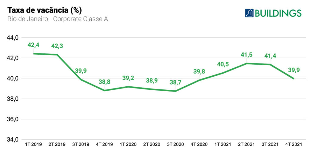 A taxa de vacância também apresentou redução, embora pequena: de 41,4% (3T/2021) para 40% (4T/2021).